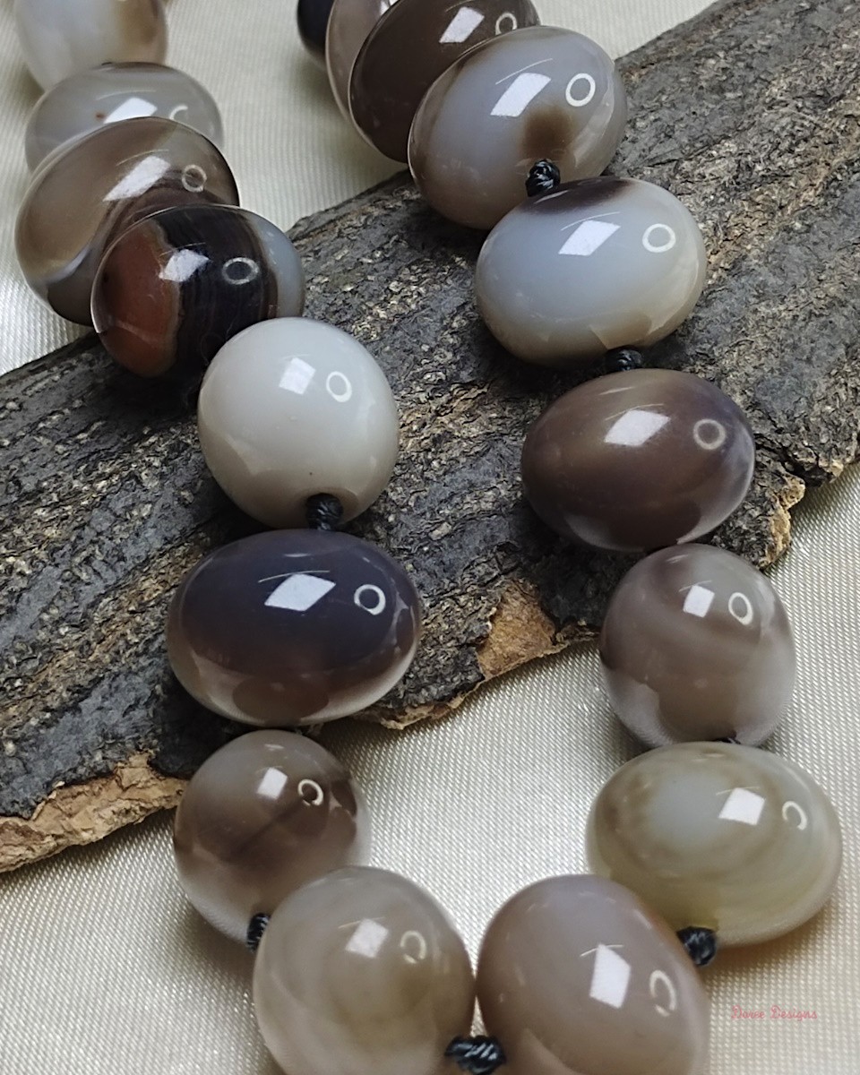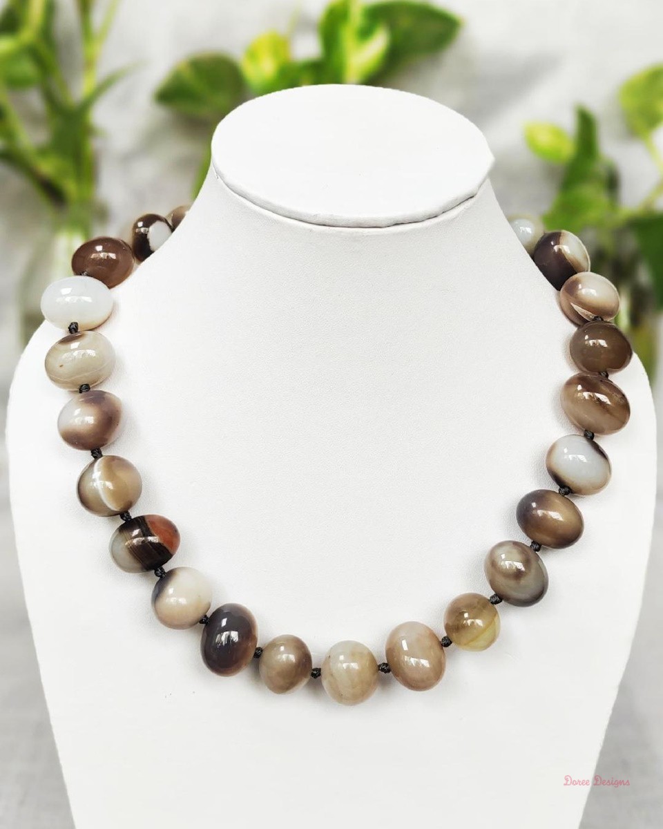 Delightful shades of ovoid-shaped white and brown chocolate coloured swirls of Onyx tumbles come together in this knotted 19” single strand necklace, with a strong spring-ring clasp for durability. DN0011Onyx Necklace – White and Brown Chocolate – DN0011