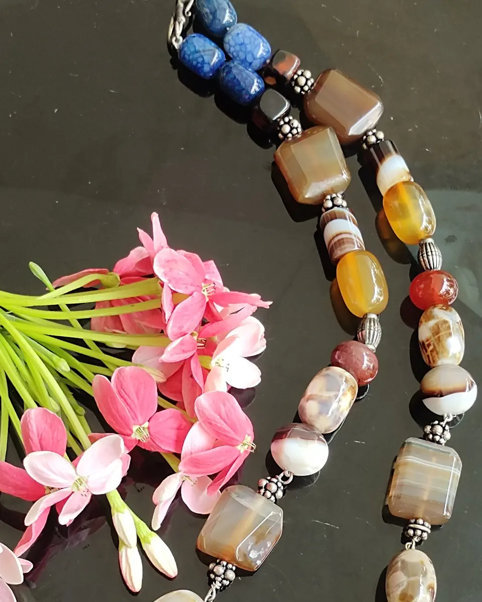A rich collection of tumbles of Onyx, Agate, Quartz, and Banded Iolite chips in soothing shades of soft browns, butter yellow, and a touch of blue and red . 26″ of mystical experience!